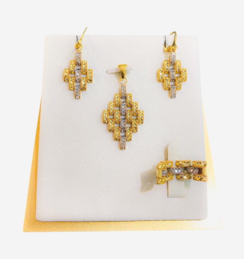 در کنار آن، گوشوارهها با وزن مجموع 4.54 گرم، درخشی هماهنگ با پلاک دارند و بهزیبایی قاب چهره را کامل میکنند.