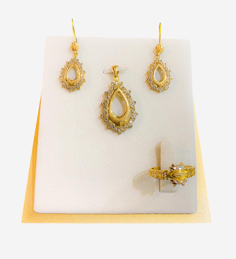 پلاک مرکزی این نیمست با وزن 1.960 گرم درخشش چشمگیری دارد و مرکز توجه هر استایل محسوب میشود. در ادامه، گوشوارهها با مجموع وزن 2.500 گرم با طراحی هماهنگ و ظریف خود، لطافتی خیرهکننده را در کنار صورت ایجاد میکنند. برای تکمیل این مجموعه، انگشتر 1.490 گرمی با فرم موازی و تراشهای دقیق، جلوهای کامل و بینقص به دستها میبخشد.