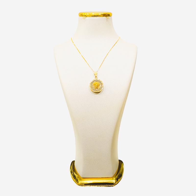 پلاک طلای ورساچ گرد نمایانگر شکوه و قدرت در قالبی ظریف و کلاسیک است. طراحی دایرهای این مدل با نماد شاخص ورساچ در مرکز، جلوهای متقارن و چشمگیر ایجاد کرده که ترکیب بینظیری از اصالت و مدرن بودن را نمایش میدهد.