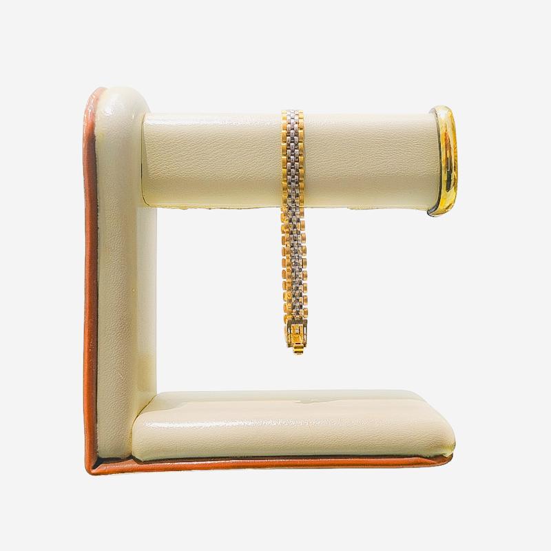 ساختار این مدل با اتصالهای منظم و پرداخت کاملاً براق، درخشش کنترلشدهای از طلا دارد که در کنار ساعت رولکس یا زنجیرهای ظریف، جلوهای منسجم و یکدست خلق میکند.